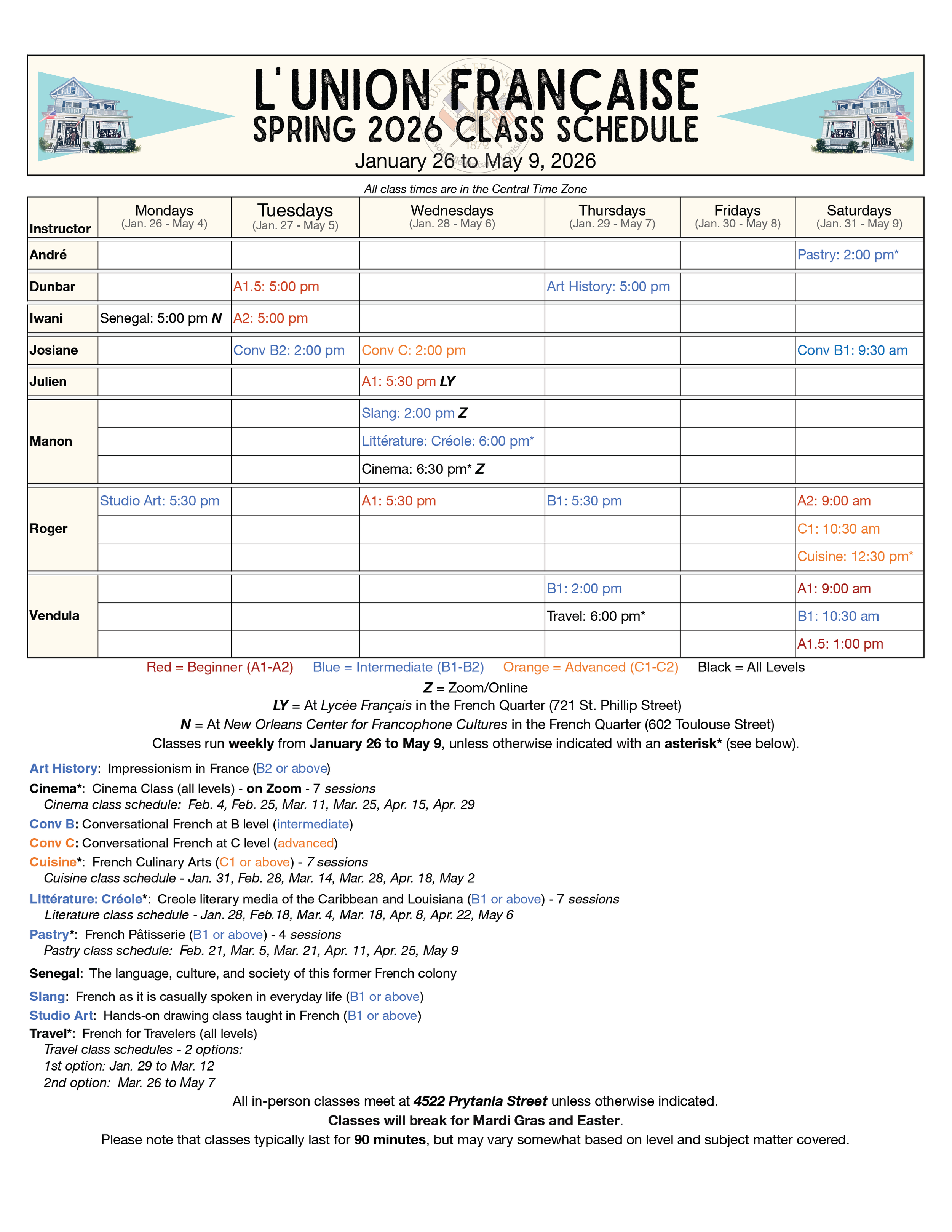 All in-person classes meet at our location at 4522 Prytania Street, unless otherwise noted.